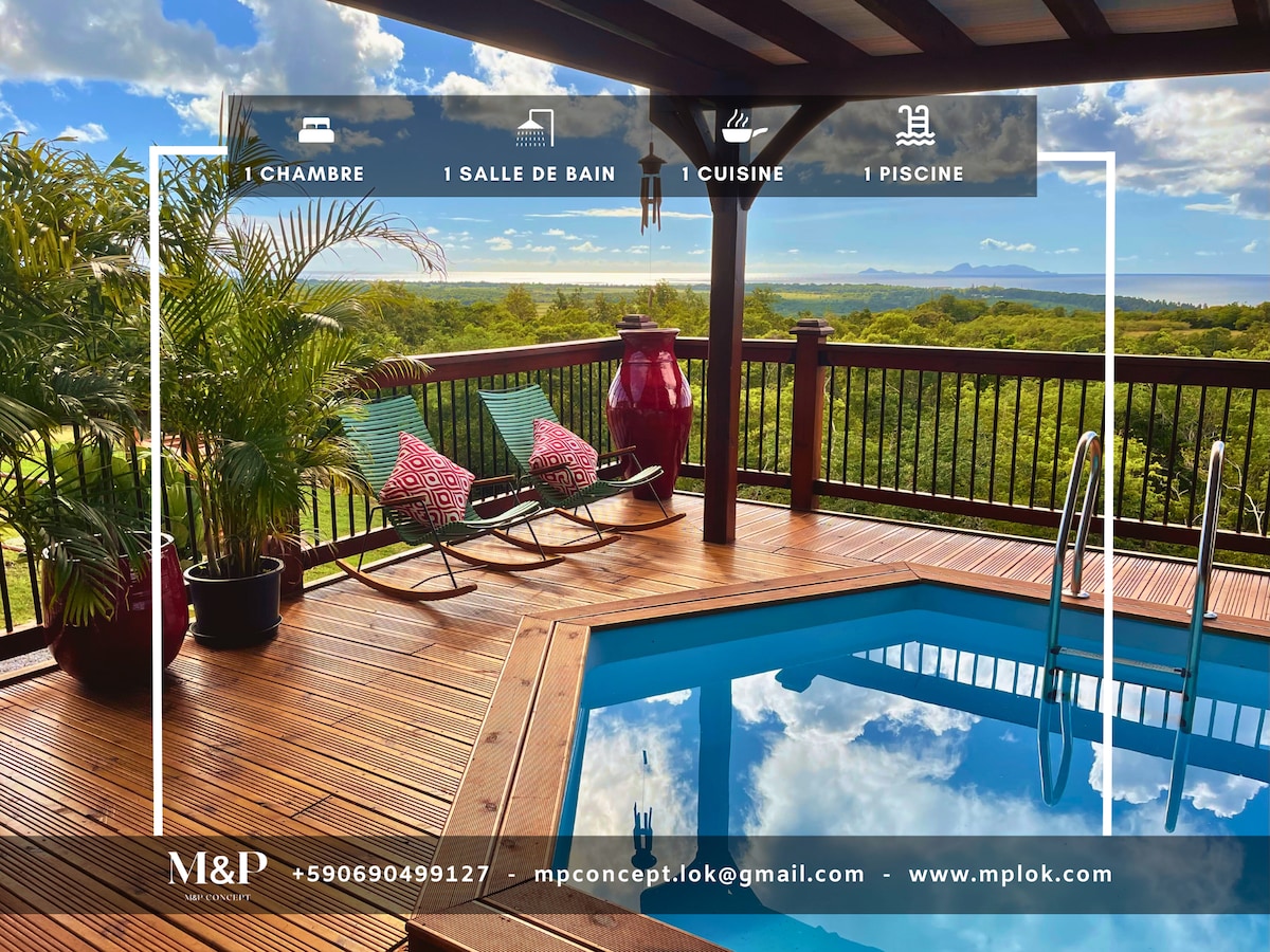 Wooden bungalows, oriented towards the magnificent sunsets of Guadeloupe and the Saintes ideal for a stay. At the foot of this home is a swimming pool to cool off and relax. A space arranged around the swimming pool with sun loungers, barbecue and small carbet.