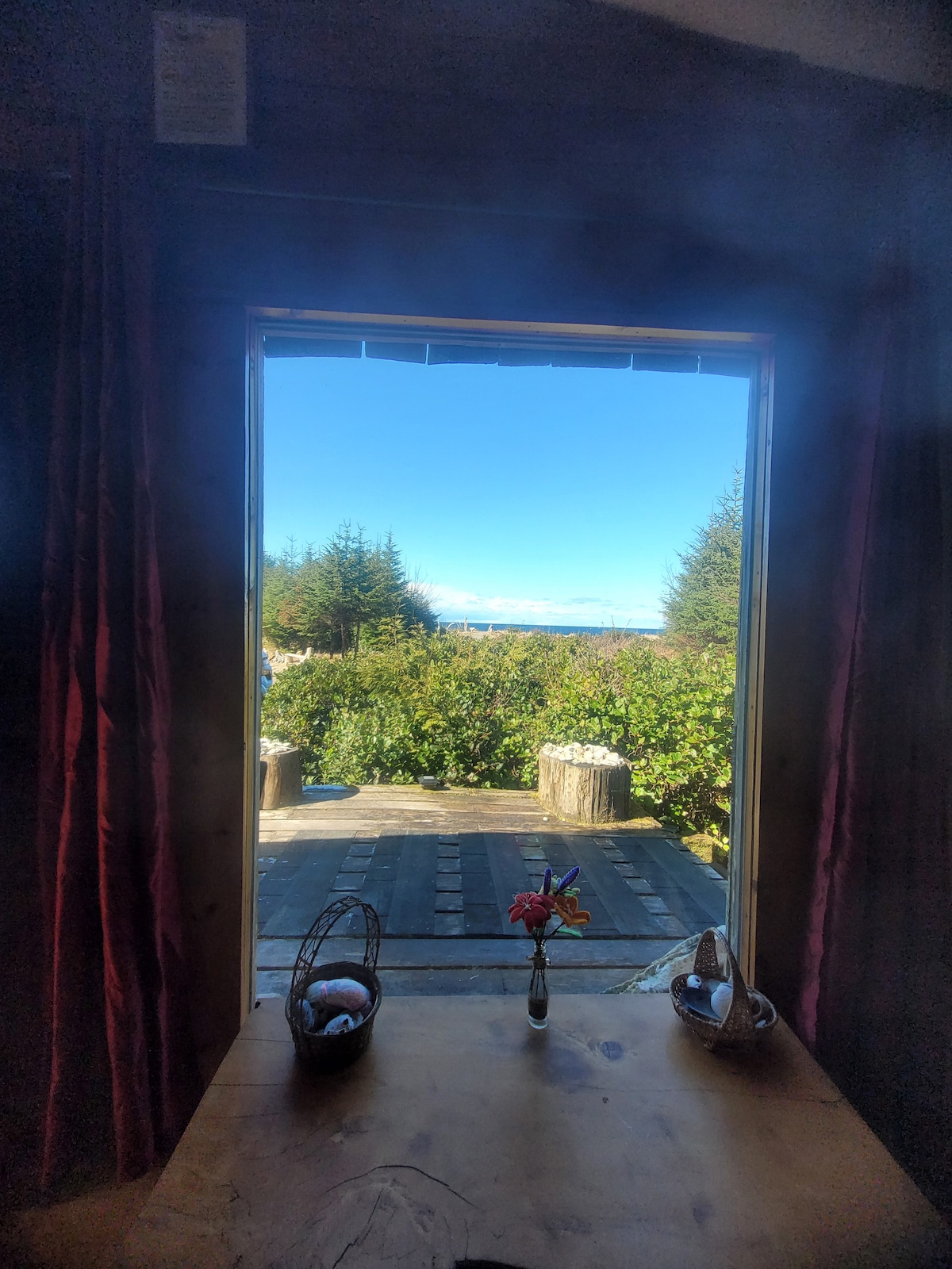 The Rainforest Studio is a new (May 2022) 700 sq ft building nestled on the edge of Naikoon Park, across the road from the expansive beaches of North Beach, Haida Gwaii. The Studio was built with unique features such as salvaged hardwood floors and a giant driftwood post. The rustic feel is combined with modern ammenities, such as a large bathtub, wifi and a heat pump. The building is one open room, with a separate bathroom, mudroom and deck.