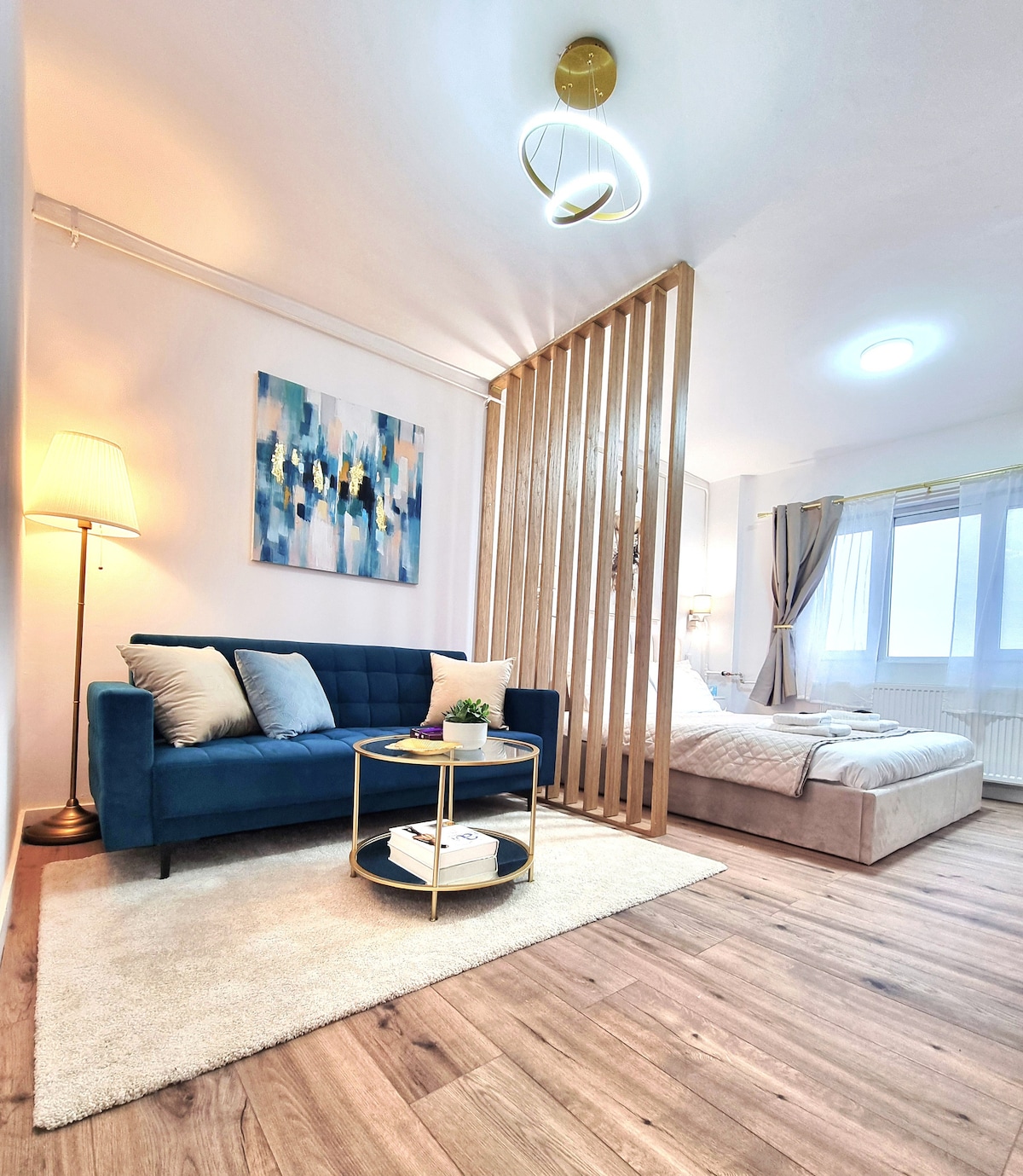Bright and spacious studio apartment located in a 10 floors building, newly renovated with a fully equipped modern kitchen with an electric hob, integrated fridge and refrigerator, and all other necessary kitchenware for making a gourmet meal. It is placed in a great area with quiet neighbourhood, less than 15 minutes to City Centre, with direct public transportation to the old town, close to a big variety of beautiful parks and lakes such as Tei, Plumbuita, Circului. Free car park available.
