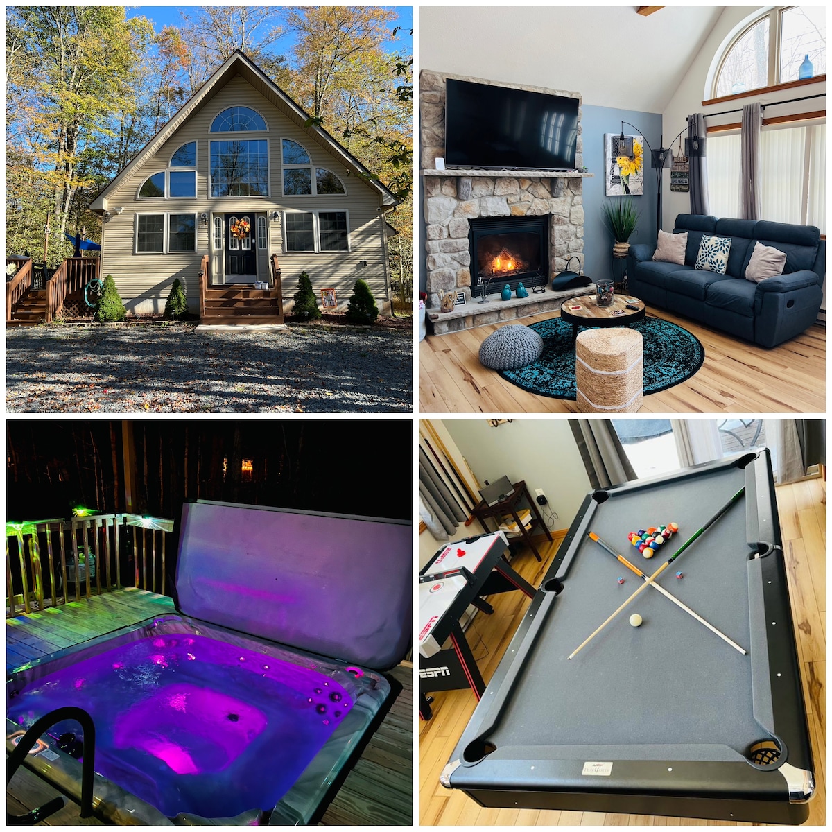 The whole group will enjoy easy access to everything from this centrally located three bedroom home designed with modern natural wood decor throughout the home. This home has everything you and your guests will need for this Pocono Mountain getaway. We are conveniently located near all major parks, casino, restaurants, bars, lakes and more. Or feel free to lounge indoors while enjoying TV's in every room, a hot tub, game room and bar, BBQ area and fire pit!