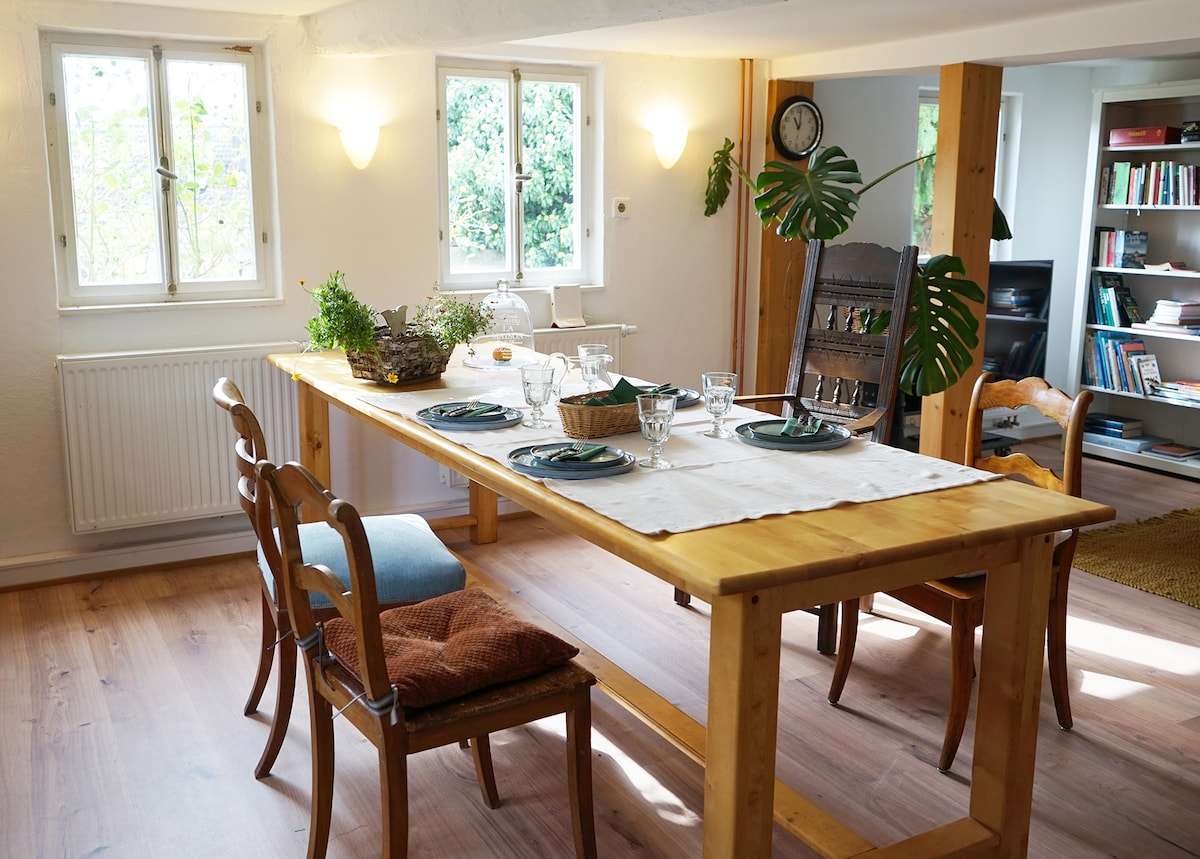 The historic half-timbered house is nestled in an unusually well-preserved medieval town with intact city walls, a castle ruin, from whose battlements you can see far into the country and an adventurous castle tunnel that leads to the foot of the fountain, on a cone-shaped mountain, which is surrounded by the Neckar on three sides. Time seems to stand still and you can find peace. Inside, however, the house is in a state that does not lack modern comfort.