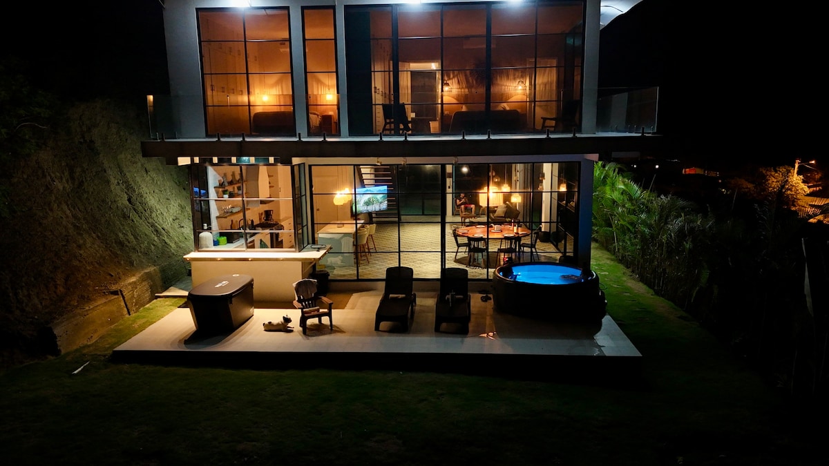 Amazing ocean and mountain views in this beautiful home inside gated community with 24-hour security. 2-3 min drive to the beach and 5-min drive to Montañita for dining, nightlife and surfing. Or just relax in the private patio with private pool, jacuzzi, plenty of hammocks and a BBQ grill. Fully furnished kitchen, large master with balcony, A/C in all rooms. NO PETS ALLOWED. Extra nightly charge after 6th guest.