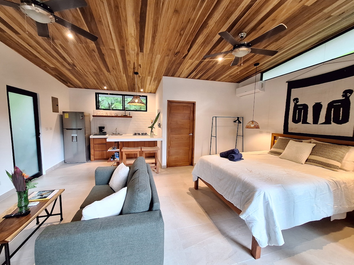 Please note: the discounted rate is due to next door constructions! Just minutes walk from the majestic beaches of Malpais, our modern home is located within a lush retreat community with 24h security & gorgeous shared pool 700m to Santa Teresa's cross, restaurants, banks & shops. Our quiet getaway is perfectly balanced for tranquil vacation in a lively town Our stylish studio offers comfortable & versatile sleeping, exquisite kitchen, cozy living room & outdoor deck with superb BBQ grill