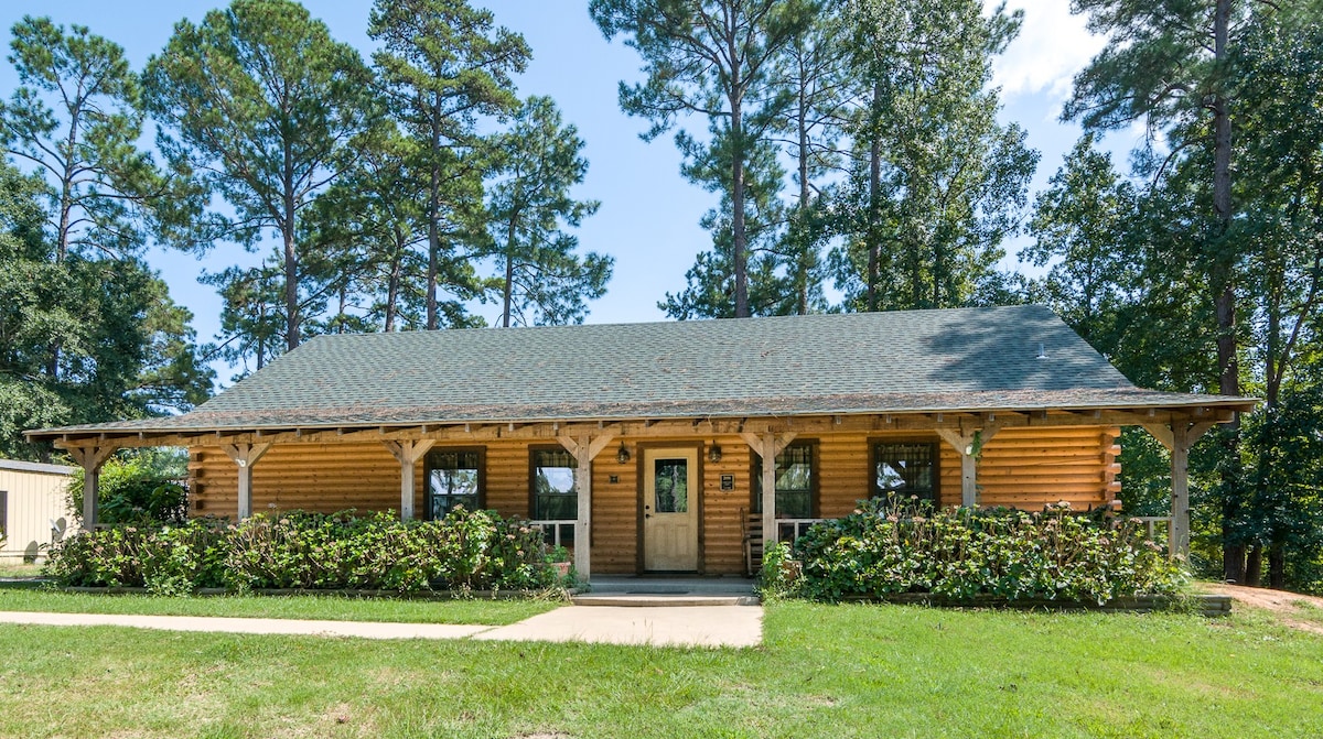 Antlers Log Cabin is truly the crown jewel of our property! Your whole group will be comfortable in this spacious and unique cabin. The cabin was built by Wayne and Kirby (the owner and his son) using pine logs cut and cured from our own property. Two walls of windows allow tons of natural lighting into the main living and dining areas. A huge wrap-around porch elevated high above the ground provides ample opportunity for enjoying the outdoors. It's the perfect large-group getaway!