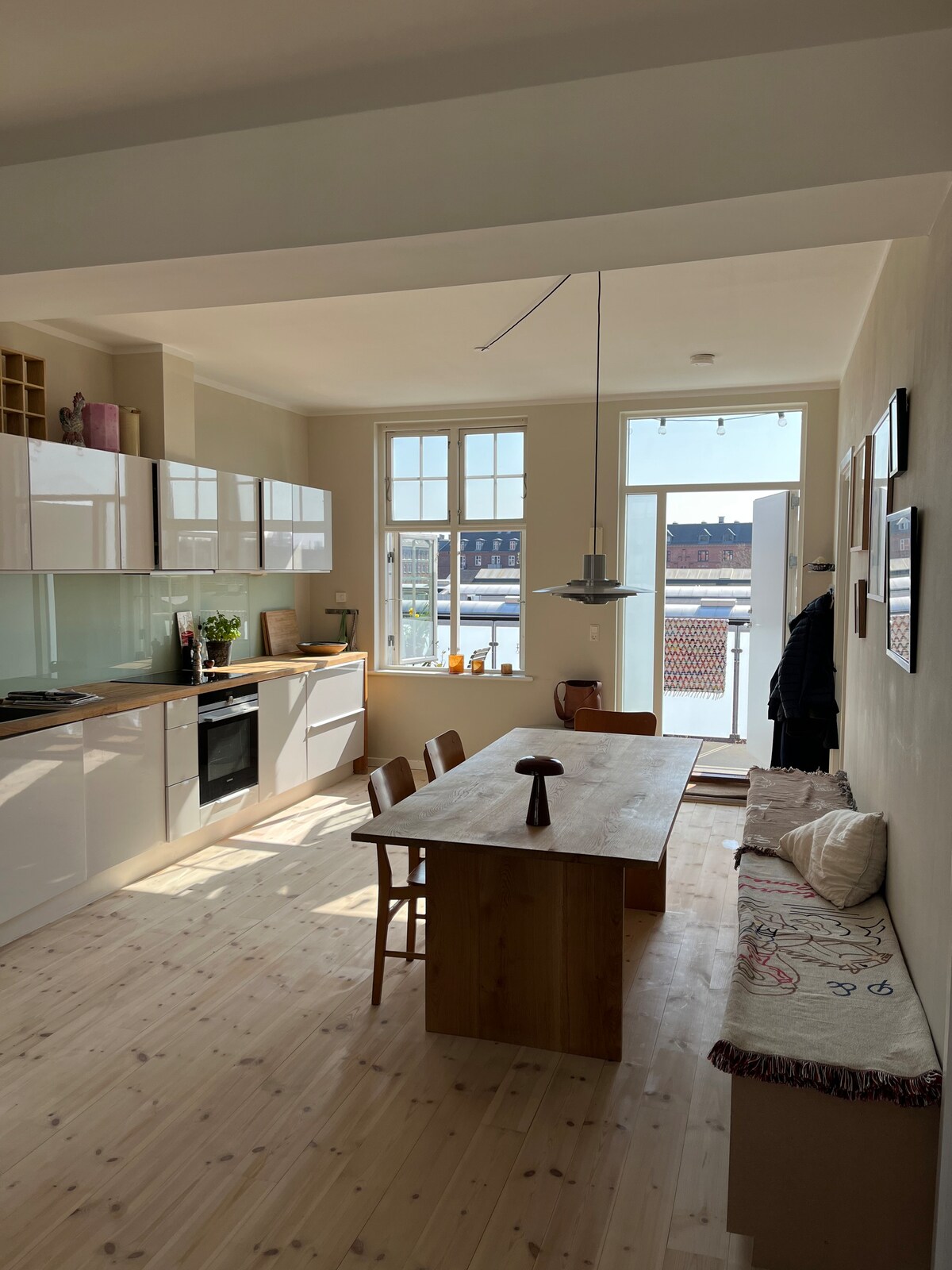Exceptionally lovely and spacious 3-room apartment, ideally located in Østerbro with close access to the metro, Fælledparken, and shopping options. The apartment is not far from the city center, which can easily be reached by metro or a short bike ride. It features a bedroom, a living room with access to a sunny balcony, a large dining kitchen, and a children’s room equipped with a double bed. The apartment can accommodate up to 4 adults or a family with two adults and two children.