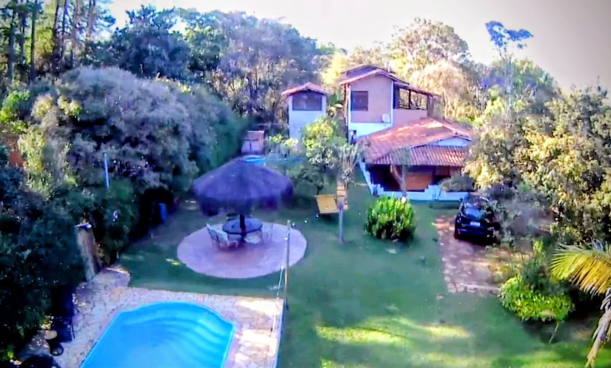 Cozy house in the mountains, 20 minutes from BH Shopping, amidst preserved woods and a beautiful view! "Far and close to everything" because we are in the mountains and close to supermarkets, bakery, pharmacy, residential condominiums. There are 3 en-suites, two of which are double, an open kitchen, mezzanine, fireplace, deck with a hammock. Swimming pool, water reservoir, lots of nature, fresh air, pleasant climate and silence. The caretaker lives on the premises.