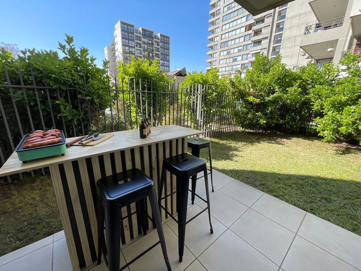 Spacious 34-meter apartment in a bright atmosphere, with thermopanel windows, air conditioning, laundry, desk, beautiful view, terrace. One block from Ñuñoa Botanical Park, near Boulevard Plaza Ñuñoa (bars, restaurants, theater) and the Ñuñoa Cultural Center. Shops, cinemas, veterinary clinic, shopping mall, bakery and mini-market next door, public transportation half a block away.