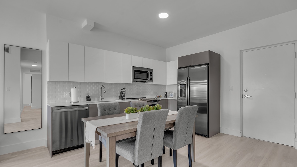 Rest & Relax in this coastal-inspired home-away from home. Features two gorgeous Suites each with a full bathroom, SMART TV & private balcony. Fully stocked kitchen, 65" SMART TV, ultra-fast 1Gb Internet, and lounge area. Premium amenities and top hospitality via your 5-Star Superhost. Sparkling Clean & fully compliant with all of AirBnb's sanitation & safety protocols. We are exempt from hosting service animals and pets due to health reasons. Just 5 min from the beach and 15 min from airport.