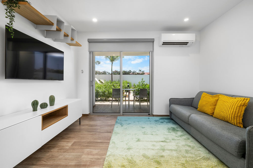 The ultimate loft for guests who value privacy, space, and value. This adults-only studio features a private terrace with plunge pool, ideal for quiet, independent stays. Inside, enjoy a king bed with a 12" memory-foam mattress, a comfortable living area with a 65" HD TV, and an ensuite bathroom with rain shower and hot water. A fully equipped kitchen and dining table support self-guided, longer stays. A curated Aruba guide is included. Private. Simple. Practical.