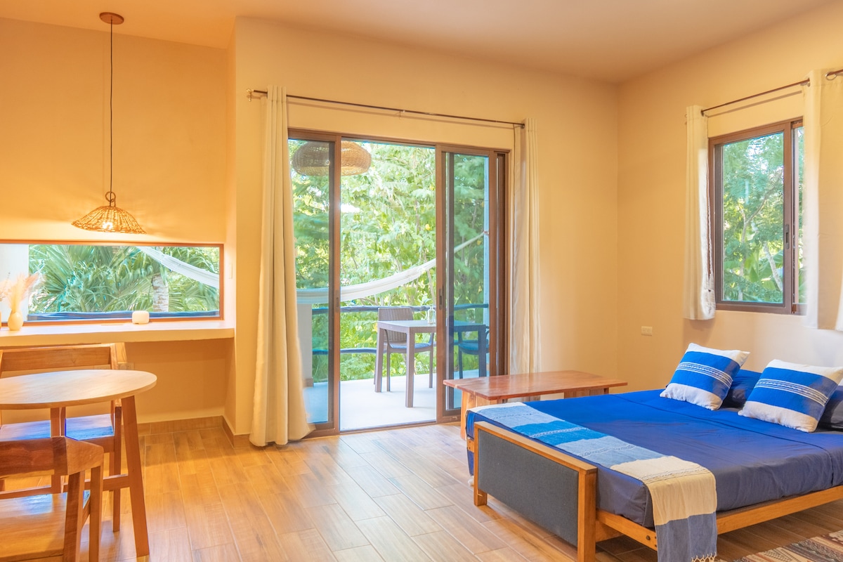 Experience a unique stay in the Iguana cabin, designed in perfect harmony with nature. Built around two majestic Jabin trees that are part of its structure, this cabin lets you dream between the jungle and the lagoon in a cozy, artistic setting. Enjoy birdwatching from the comfort of your beautiful terrace with a view of the lagoon, or relax on the dock with a palapa over the water, surrounded by a lush tropical garden.