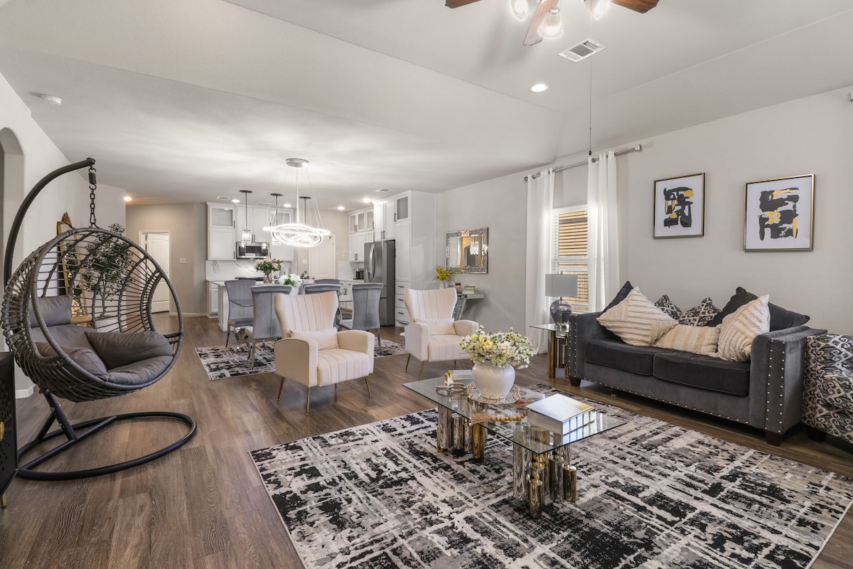 ✨ Spacious 5BR Home + Extra Room | Sleeps 12-15✨ Enjoy comfort and convenience in this beautifully furnished home featuring 2 master suites with king beds, 3 queen bedrooms, and extra room with air mattresses. Modern living area, fully equipped chef’s kitchen, and luxury outdoor patio with BBQ grill. Blackout shades, plush bedding, fast WiFi, washer/dryer — everything you need for a relaxing stay. Located close to top attractions, dining, and shopping.