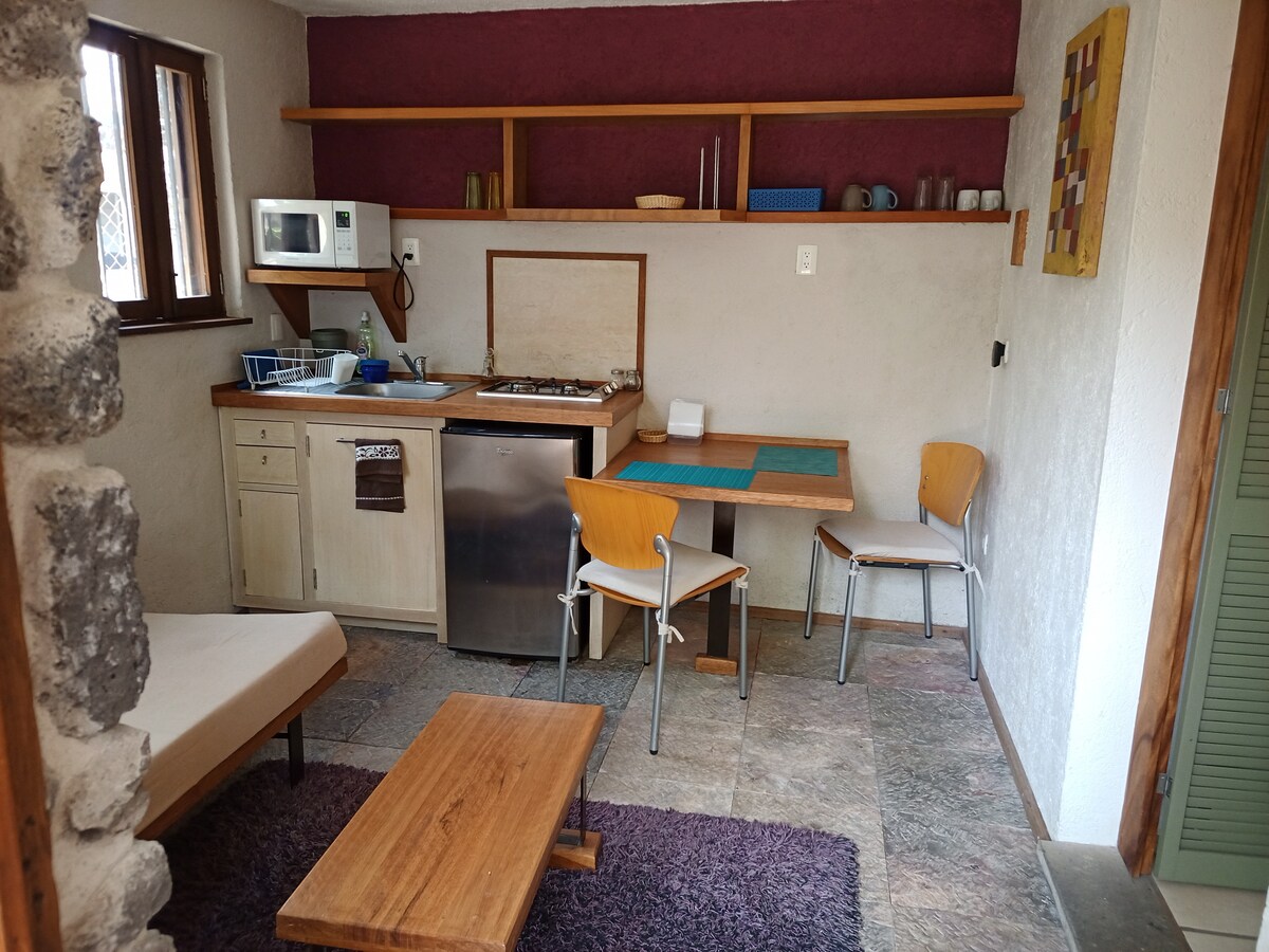 Mono Ohtonqui is our newest and most recent opening in "El Arrayan" Mono Ohtonqui (caminante / the walker) Modern studio on the top of a colonial building! Only four blocks from downtown. Perfect for a couple who want to explore the splendor of sunrises in Tepoztlán. The balcony is in the top of a beautiful black pepper tree. The design mixes modern architecture and Mexican and North African accents.