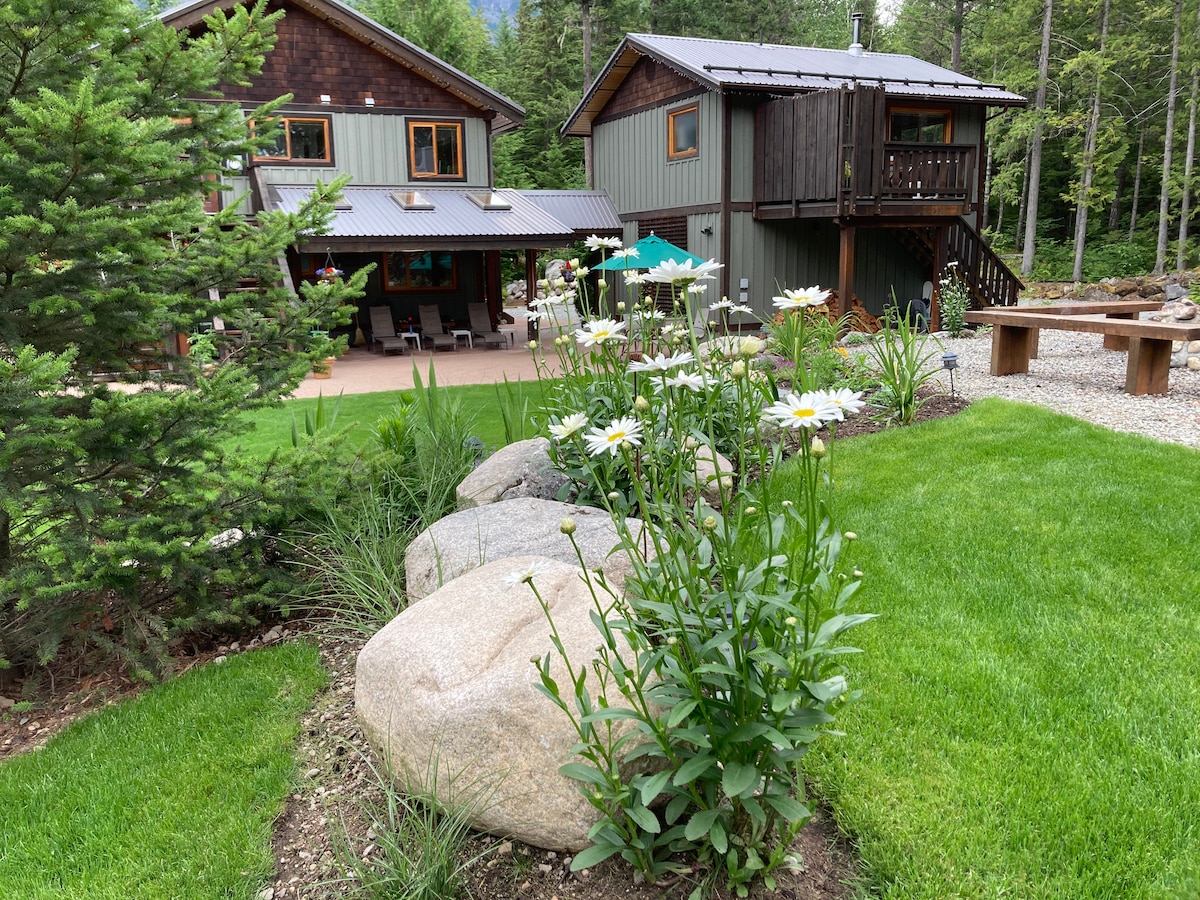 Private getaway located on acreage surrounded by forest with views of Mount Currie. The suite is south facing on the lower level of the house with a private driveway + entrance. The decor is rustic yet modern with plenty of natural light so it’s cool and airy in summer, cozy by the fire in the winter. Entertainment includes theatre with 85" 4K TV + 7.1 surround, PS5 (1 remote), popcorn, bubble hockey, billiards, games, sauna + 5 person hot tub. Located 45min N of Whistler. IG: @OwlRidgeLodge