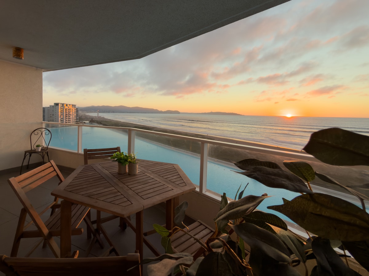 Apartamento frente a la playa en La Herradura. Despierta con el sonido del mar y disfruta de un amanecer increíble desde la terraza. El condominio cuenta con acceso directo a la arena e incluye estacionamiento privado gratuito, TV, Wi-Fi de alta velocidad y cocina completamente equipada. Podrás disfrutar de amplios espacios comunes perfectos para toda la familia: quincho, saunas, piscinas, jacuzzi y áreas de juegos infantiles. “Te esperamos para que vivas una experiencia única junto al mar”