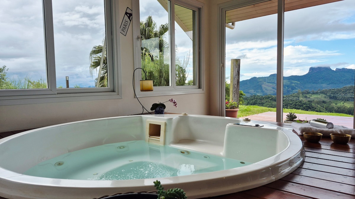 Casa Tempo: Your Time to connect with nature. Immerse yourself in tranquility, contemplate the hills, and recharge with the stunning view or in the chromotherapy bathtub. Here, Time serves to rediscover the essence and create memories. We are a family project and live on the premises. Our property is gated and the cabin is fenced, ideal for relaxing safely, without giving up comfort. Your pet is welcome here. Insta: @tempomantiqueira