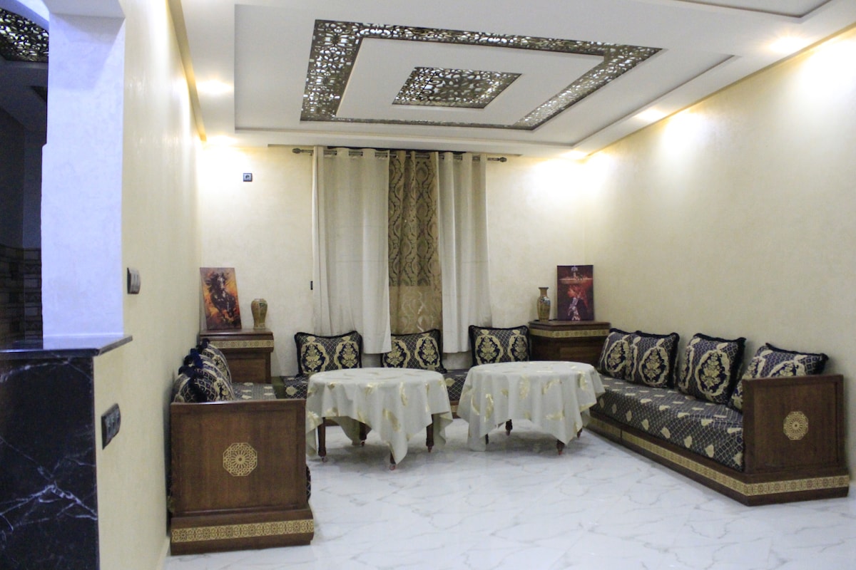 Residence Centre Estivage Imi Ouaddar paradise beach 26 km from Agadir towards Essaouira in front of Hotel paradis 150 m to the beach and close to the Imiouaddar pharmacy Duplex Villa de RC and floor surface 120m to RC and 70 upstairs 3 bedrooms Moroccan living room 46 inch smart TV Wi-Fi Large open kitchen 2 bathrooms, balcony 2 sunny garden yards south view secured with cameras and parking 9 people comfortable family-only no parties and pets not allowed