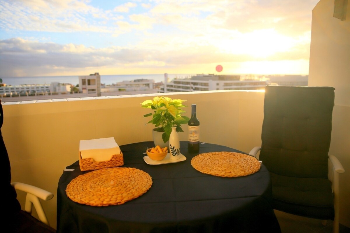 Welcome to our fully refurbished studio with an impressive ocean view, close to beautiful beaches and surf spots. Equipped with fast Wifi, smart TV, fully supplied kitchen, wonderful shower, washing machine and all comforts. Guests have free access to the swimming pool. The bus and taxi station is right in front of the studio. There are supermarkets and shops in front of the studio. Just 5 minutes walk from Playa de las Américas, 8 from Playa de Troya. 15km from the airport.