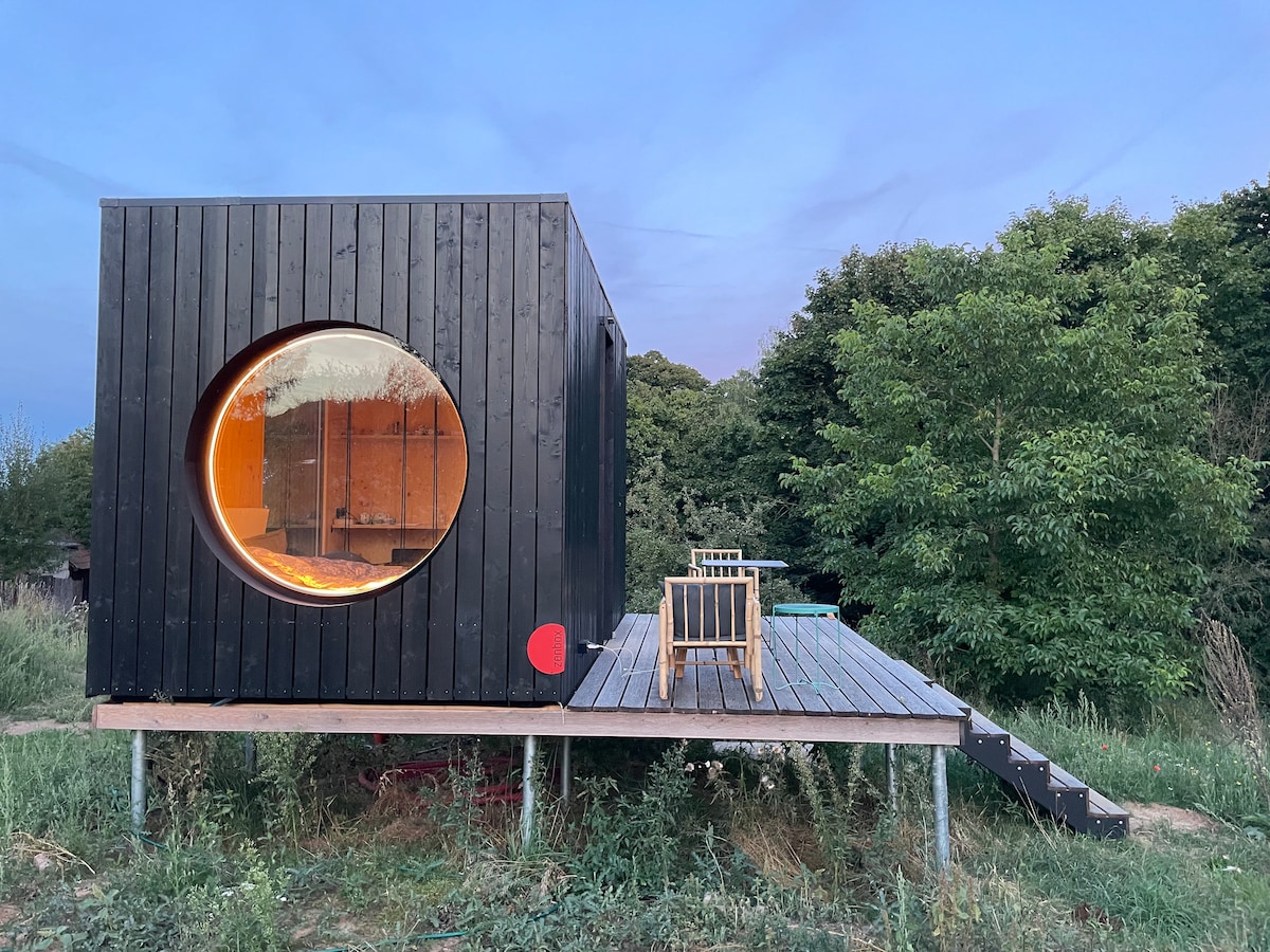 Tiny house s kulatým okem navržený a realizovaný architektonickým studiem Zenbox se nachází v bývalém sadu u fary Křečov mezi polem a farní zahradou. Je to zateplený celoročně obytný plnohodnotný domek s topným panelem, se samostatnou koupelnou, v níž najdete splachovací wc a umyvadlo se studenou vodou.