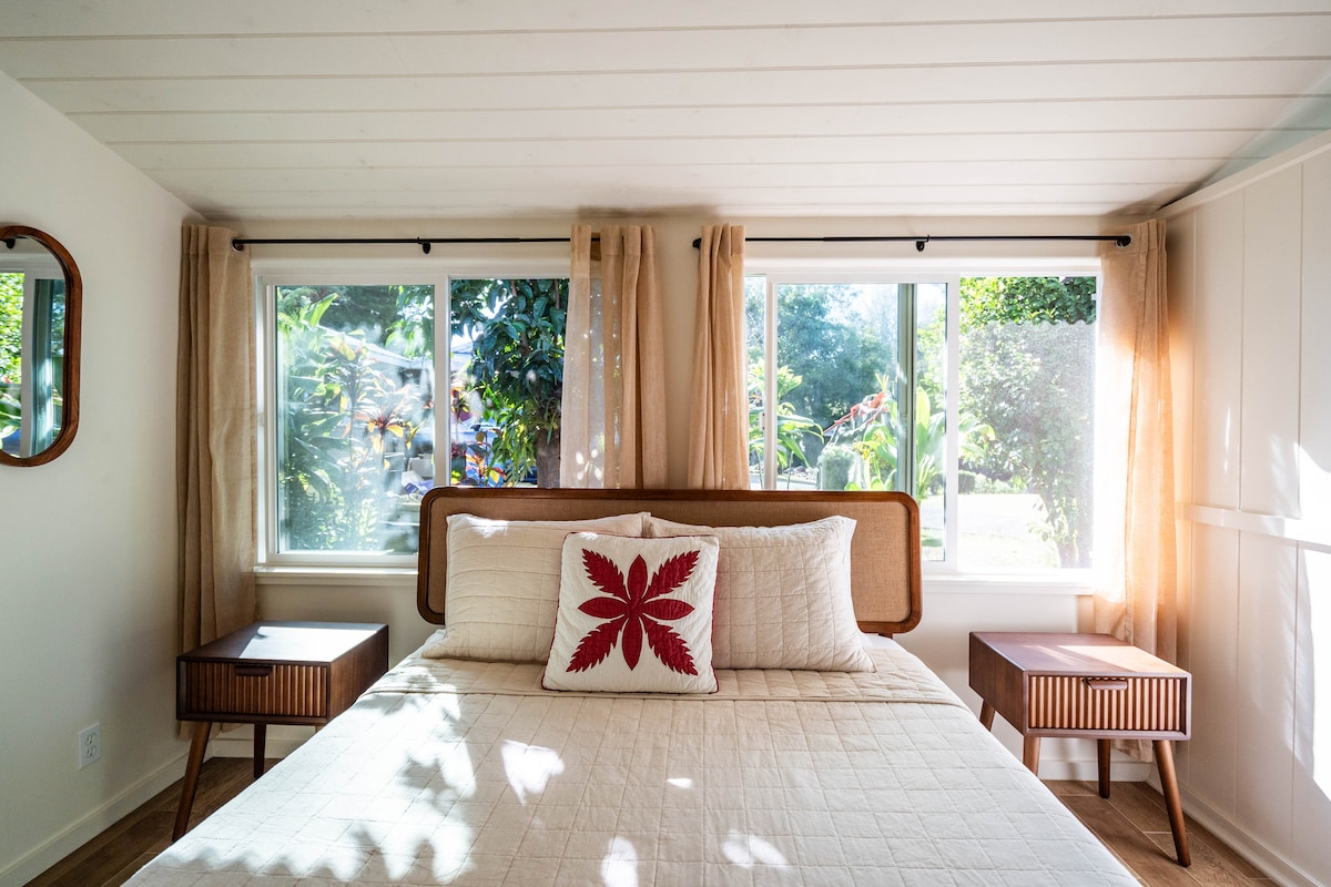 This is a comfortable 2 BD/2BA with rustic modern & eclectic decor, situated on a beautiful private acre of lush greenery. The living area is an open concept kitchen & living room with grand floor-to-ceiling windows showing off views of famous Mauna Kea. The generously sized master bedroom has a brand-new Avocado cal-king bed and a second bedroom offers a cozy queen. With a fully equipped kitchen & amenities, this is a perfect home base from which to begin or continue your Big Island experience!