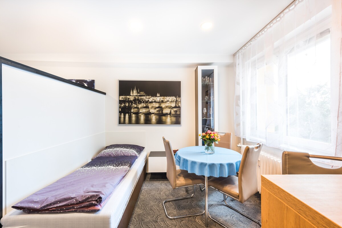 The nice simple appartment with separated entrance from a street - contents from main room, bathroom and hall. There is no kitchen, only kettle and mini fridge and some dishes for breakfast and snack. Appartment is opposite to the beautiful largest forest in the Prague. In front of the house is small zen-like garden and small zen-like garden is also on the opposite side.