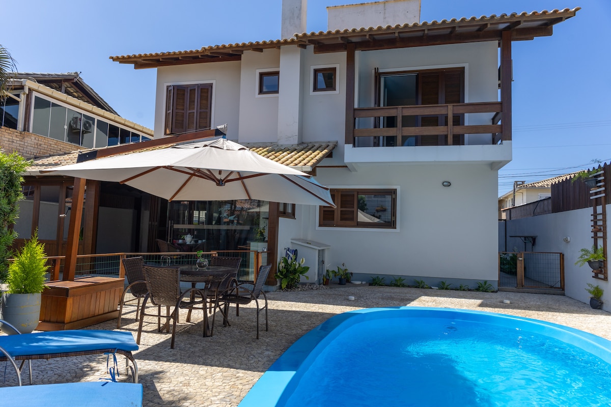 Excellent house with direct access to the beach! There are 4 bedrooms, 3 suites, balcony and barbecue area connected to the garden and pool. Located in a condominium with only 3 residences,in a quiet street, with easy access to the best beaches of the North of the Island! Five minutes from Jurerê. Exclusive condominium with homestay. Pool and large lawn are shared only by the three residences. Cozy,with Mediterranean references, here you can relax with standing on the sand!
