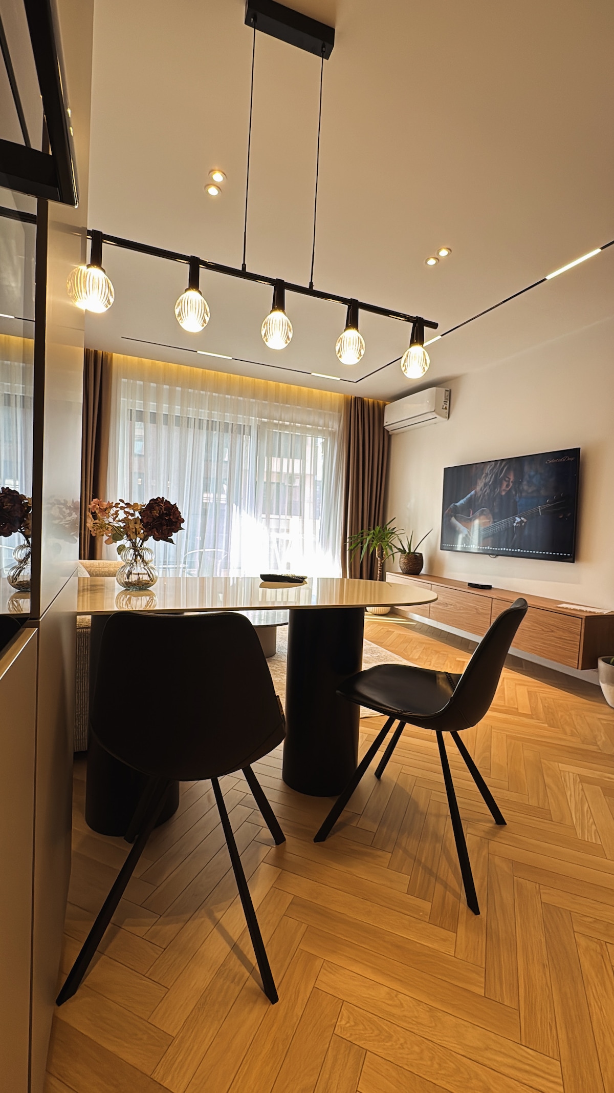 Ruby Apartment is designed in a modern style, combining elegance with comfort. The interior features clean lines, neutral tones, and carefully selected contemporary furnishings. Large windows allow natural light to flood the space, creating a bright and welcoming atmosphere. Every detail is thoughtfully curated, from the minimalist decor to the high-quality materials, offering a stylish yet cozy living experience. Ideal for those who appreciate modern aesthetics and functional design.