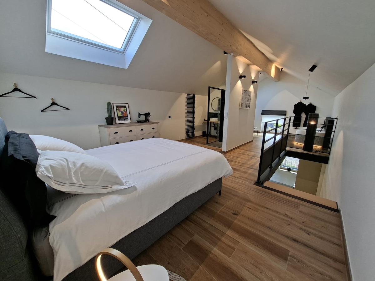 Exceptional contemporary accommodation for a couple in the beautiful Meuse Valley, 15 minutes from Namur, 20 minutes from Dinant. Suspended panoramic terrace, breathtaking views! Calm and tranquility in the heart of nature. Fully equipped kitchen (oven, induction cooktop, fridge, dishwasher, wine cellar, dishes, Nespresso machine, toaster, kettle) Cozy atmosphere, small living room, double-sided gas insert. King bed. Bathroom with walk-in shower. Total privacy! No smoking allowed
