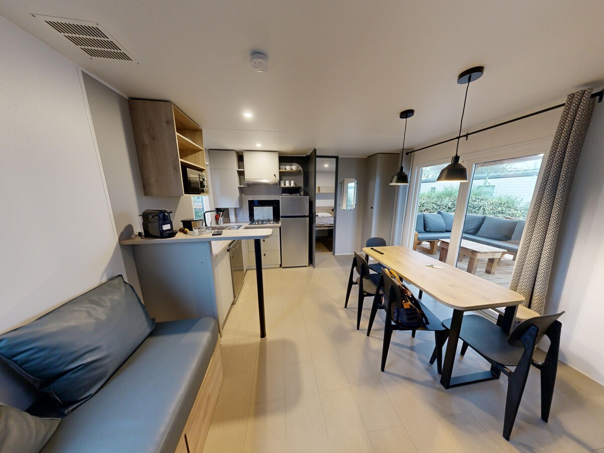 Venez profiter de l'étang avec un accès direct et aussi de la mer tout proche dans notre maisonnette au bord du lac marin Cuisine équipée, lave-linge, tv. Chambre cabine : lit superposé Mezzanine avec lit et espace bureau Canapé lit,terrasse avec table et store Clim réversible, parking sécurisé. Draps et serviettes non inclus,possibilité de location avec conciergerie. Accessible à pied : LIDL, base de loisirs, école de voile et accrobranche à 200m, plage 10min à pied par accès sécurisé (tunnel)