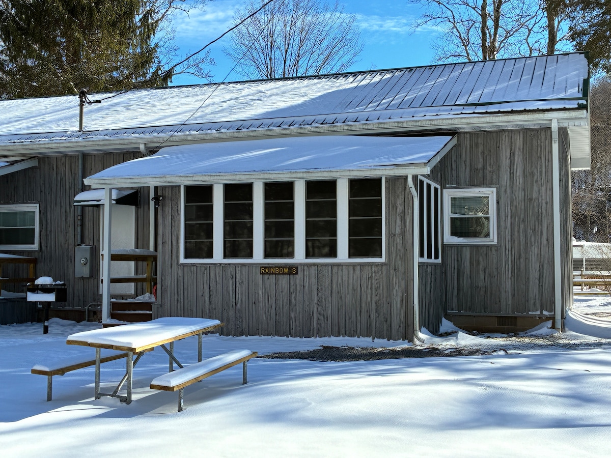 What used to be a 1950's schoolhouse is now a beautifully-NEWLY renovated cabin in Revelle's River Resort... 2 Bedrooms, Full Bath, Full Kitchen. Queen Sleeper in LR. All 3 Rainbows do share 1 Hot Tub. Just steps away from the Shaver's Fork River, guests have access to some of the area's greatest trout fishing. Bring the children and join in on our scheduled activities. PETS ARE WELCOME FOR A FEE BUT MUST BE APPROVED AT TIME OF BOOKING. NO EXCEPTIONS.