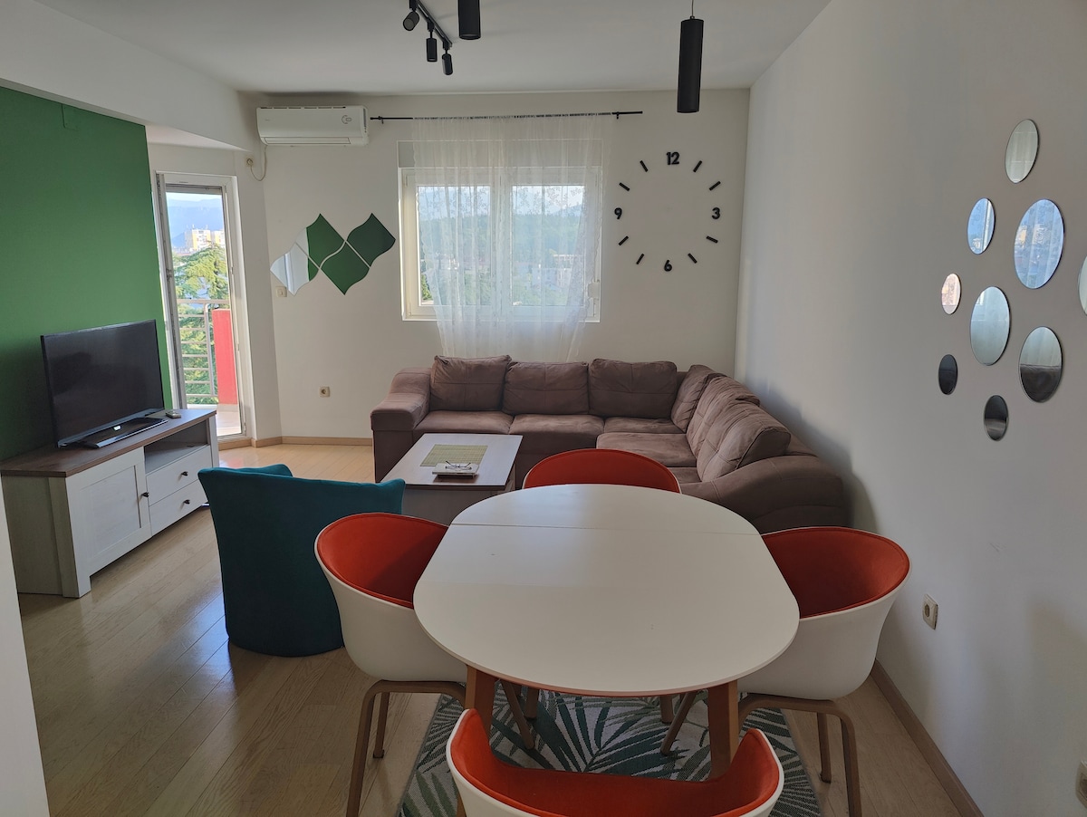 Brand new, spacious and cozy 3 bedroom apartment, located just 13 km from Podgorica city center from one side and 14 km to Airport Podgorica. Main European road, 12 km from Albanian border Hani Hotit. It fits perfect for 1 to 8 guests, 2 bedrooms have double king size beds and third room has 4 single beds.