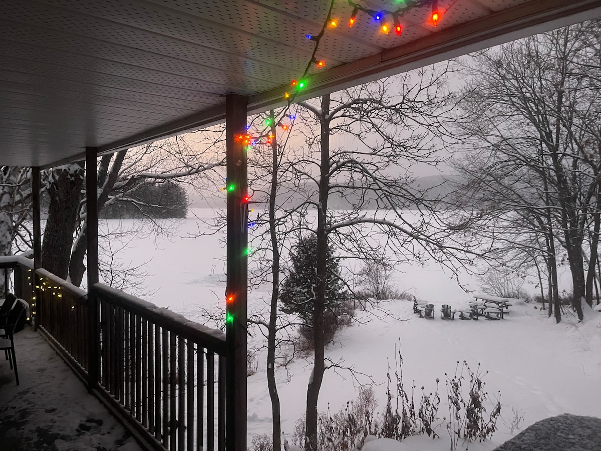 Relax with family & friends and enjoy this beautiful updated lakefront oasis in every season:). Spacious, bright open concept, fireplace, lrg deck, AC, radiant heat, smart TV, 100 ft waterfront, private beach!:) West facing, spectacular sunsets, panoramic views! Spring/ Summer hiking, fishing, camp fires and paddling! Amazing swimming, boating & memories to be made:) Winter skating, cross country & nearby downhill skiing, snowshoe, snowmobile (OFSC trails), ice fish, campfire s’mores & more!