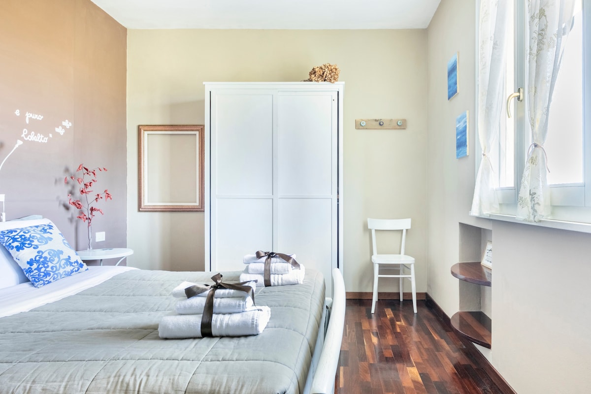 Camera matrimoniale con finestra per massimo 2 ospiti con bagno completo e disimpegno in comune con altra stanza.