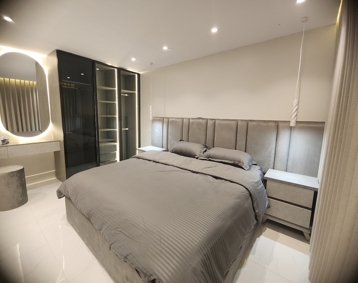 The apartment is characterized by its calm and elegant decoration. It is also characterized by its strategic location in the north of Riyadh and its proximity to the Boulevard, with a distance of no more than 900 meters