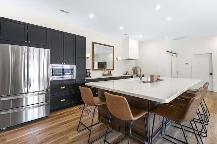Heading indoors, the brightly lit, modern interior is a welcome respite from outdoor adventure. Its open floor plan is conducive to gathering and entertainment, all the while keeping the views of the tranquil water front and center. Kick up your feet on the living room’s U-shaped sofa while you stream a movie on the large, mounted smart TV. Steps away, the stylish kitchen is a chef’s dream, fully stocked with stainless steel appliances and all the cookware and dining ware you’ll need to prepare delicious meals right from home. The sizeable island can serve as an option for meal prep or dining on the high-top barstools for 8, or seat together for formal meals at the table for 10.