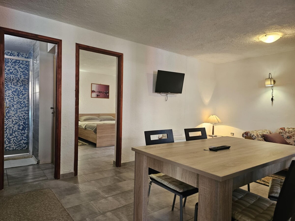 Apartman ima prostrani interijer te svu potrebnu opremu za vaš ugodan boravak i odmor. Spavača soba s krevetom 160*200, udobnim madracem za slatke snove. Kuhinja kompletno opremljena s staklokeramičkom pločom, mikrovalna, kuhalo za vodu i pribor za kuhanje i jelo. Ugodan kauč po potrebi na razvlačenje (140*200), klima uređaji. Kupaonica s tušem. Terasa se nalazi izvan apartmana zajedno sa ostalim. Drvo ima glavnu ulogu u ovom apartmanu, slike ga prave posebnim dok vi uživate u čitanju knjige!