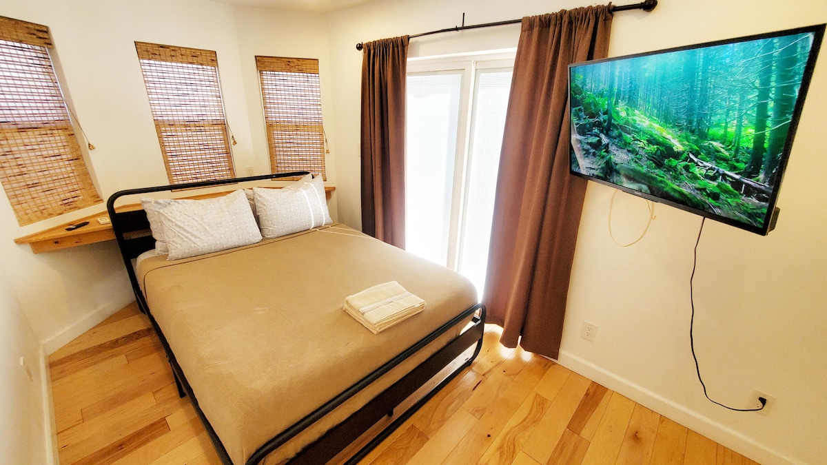 Welcome to your serene retreat! Perfect for a romantic getaway, this charming guest suite offers a private entrance and designated parking. Inside, enjoy a spacious oasis with a king-size bed, plush memory foam mattress, and a Jacuzzi tub. Refresh under the rainfall shower and take in mountain views from large windows. Blackout shutters ensure restful sleep. Unwind in front of the 55" OLED TV or work at the desk. Experience comfort and tranquility in this delightful space!