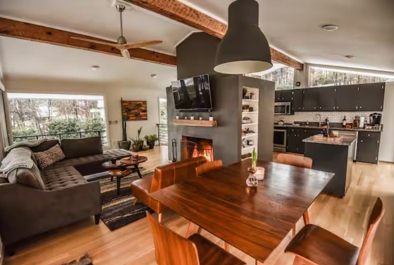 Just an hour from RTP, this sunset lakefront retreat is designed around the view, with expansive glass walls that bring Hyco Lake right into the living space. Spend the day on the water—launch a kayak, cast a line from the private dock, or relax by the lake—then unwind in the hot tub or around the fire pit as the sky turns gold. Perfect for romantic getaways, girls' weekends, or a peaceful midweek reset. Fast WiFi makes remote work easy, with on-site EV charging.