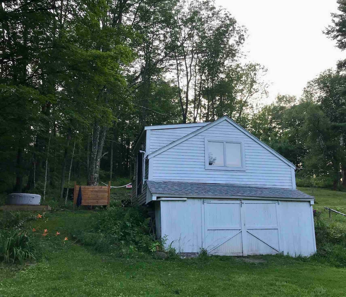 The cabin is located on a dirt road on our farm with a beautiful pond and an amazing view! This off-grid, cabin has two queen beds (100% cotton sheets), a mini-kitchen with a battery-ignition gas range, solar powered refrigerator, solar lighting, a wood stove, an outdoor shower, a fire pit, and an old-fashioned outhouse. An expansive porch and dock provide comfortable outdoor living. A seasonal favorite, the cabin is available May-Oct.
