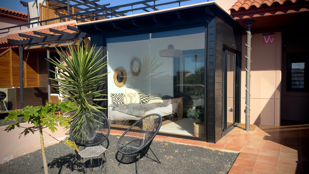 Experience the neuroarchitecture of this bioclimatic loft. Beach, ocean views, and fiber optic. 100 meters from Corralejo beach, we have created a natural habitat with views of the sea, Lobos, and Lanzarote. The design, based on the local climate, provides thermal comfort by taking advantage of environmental sources, as well as an aesthetic integration with the environment. All the necessary equipment in a quiet and residential environment, with nearby services (a few meters away and on foot).