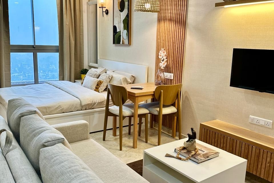 Luxury studio with cozy interior in Hiranandani Estate with stunning creek & Mountain View Amenities • Couple Friendly • Queen-size bed with plush linen and pillows • Smart TV, high-speed Wi-Fi, and air conditioning • Fully equipped kitchenette with refrigerator, kettle, and utensils • Modern bathroom with premium fittings and hot water • Private balcony with panoramic view • 24x7security, elevators, and secure access Ideal for solo travelers, couples,business guests or Small family