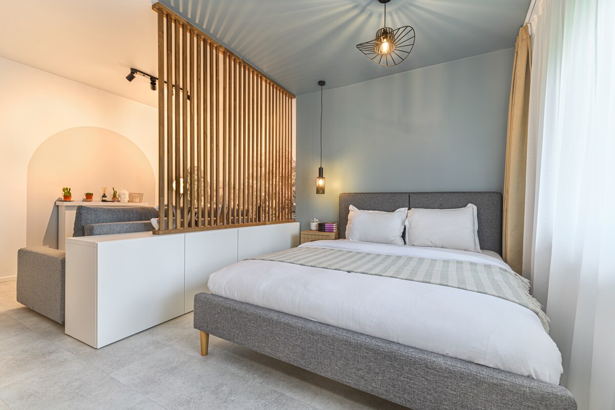 Inspired by the Lyra constellation, Nokturna Lyra is a sanctuary where design and light form a celestial symphony. Vega’s radiance glows across the ceiling, while the bedroom’s warm tones and lunar halo evoke tranquil nights. Copper and stone enrich the kitchen like nebular dust, and soft geometry shapes every corner. Refined yet ethereal, this modern constellation of comfort invites you to live not just beneath the stars, but among them.