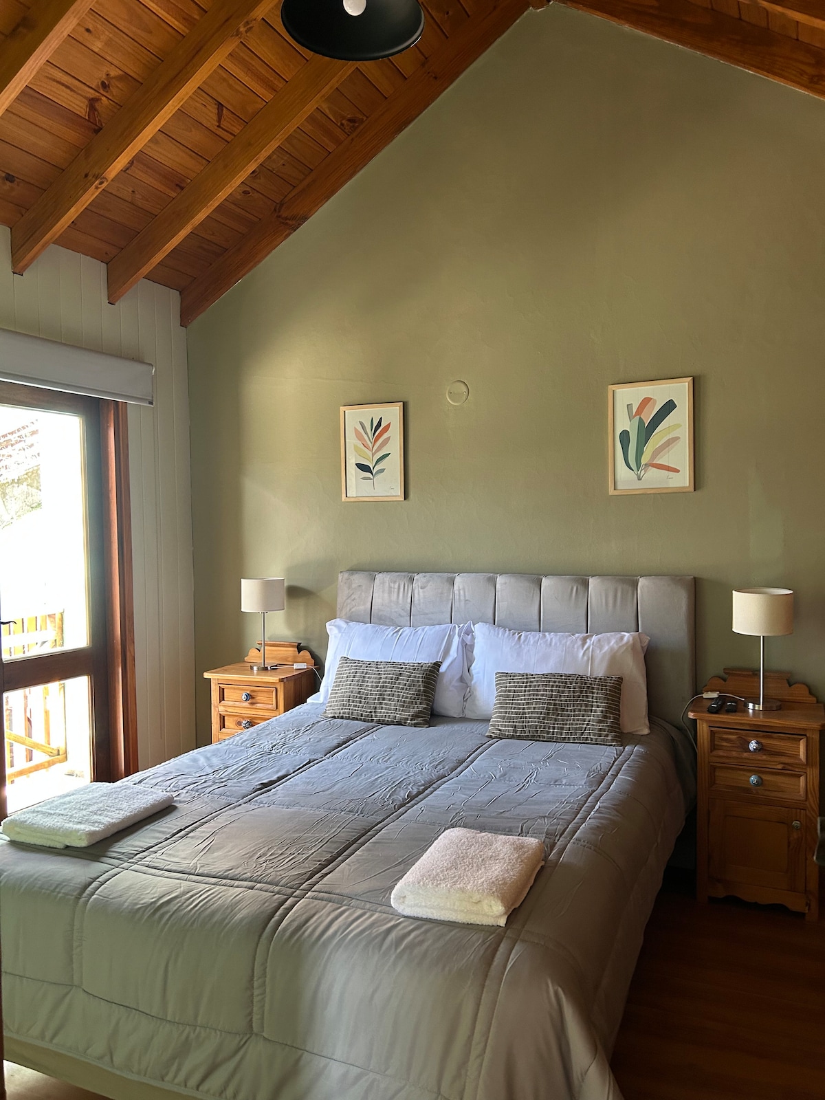 Warm wooden cabin surrounded by nature, with green space for barbecues, three minutes from downtown. It combines simple and tasteful. Sleeps up to 5 passengers. Neighbor to Casa Los Robles, suitable for up to 8 passengers, ideal combination, ideal combination - CASA Y CABIN LOS OAKS - for vacationing with friends and large families. (see publication "Casa Los Robles" in air b&b ) Terraced garden, access by stairs. Parking in front of the cabin.