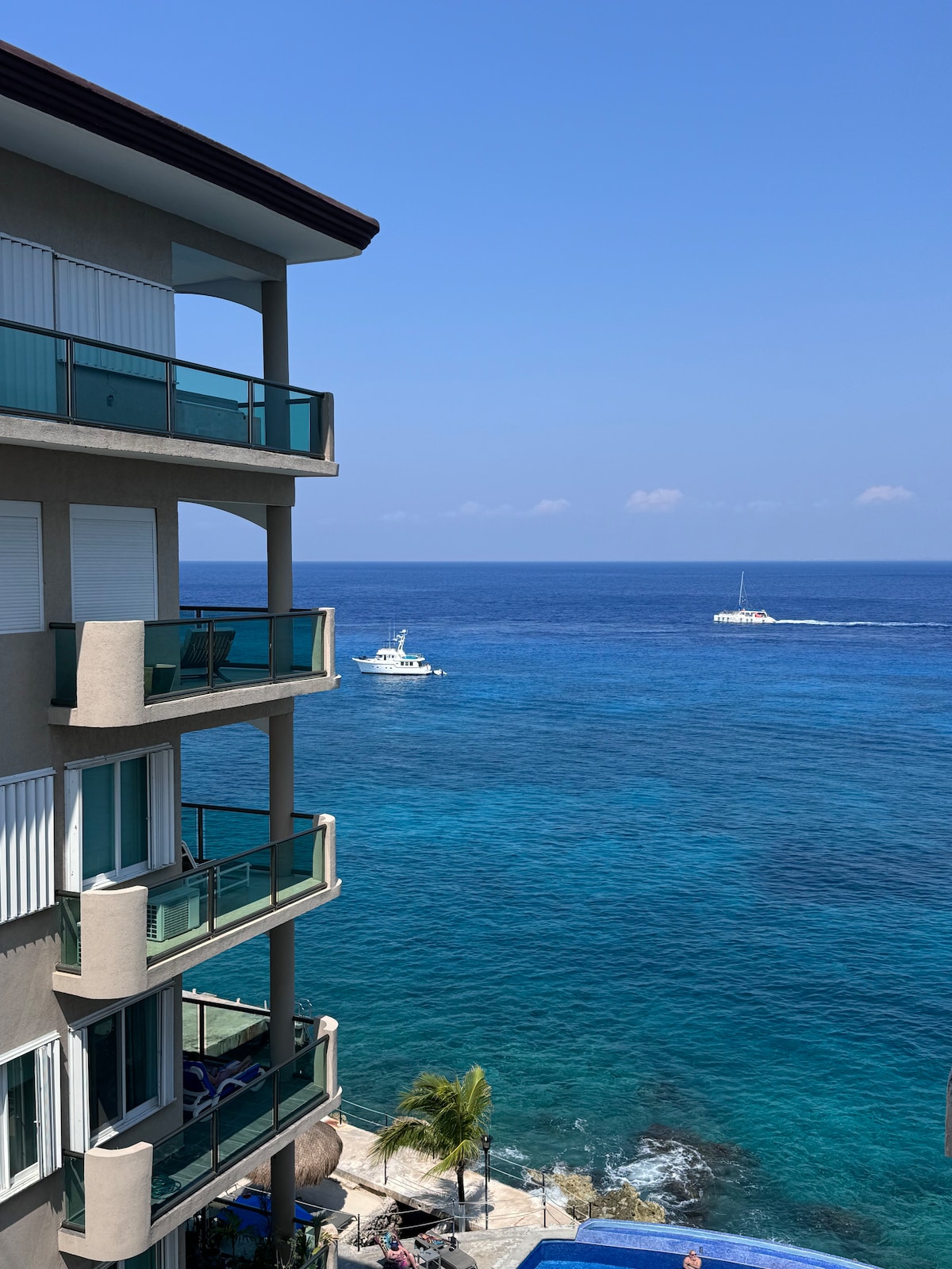 Cool Caribbean views from our oceanfront modern colonial condo, situated in the heart of Cozumel. Enjoy the Caribbean breezes sitting on your ocean front balcony or watch Carnival from your street side balcony. Walk to restaurants, shops. Beautiful ocean views. Beach access is 1/2 block away. We have included a desk for those who require a workspace.