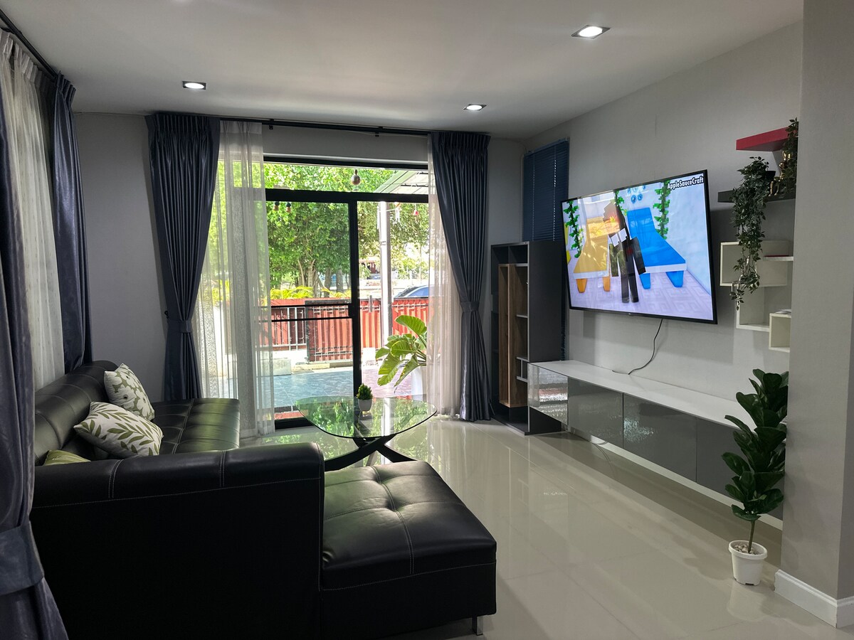 A cozy home in the best area of Hang Dong with 2 bedrooms, 2 bathrooms, and high security.Just 11 minutes from the airport, near Panyaden International School 1 km,Montessori 2 km,SBS International School 2.9km,Kad Farang 1 km,HangDong Market 1.7km,Sports Complex 1 km,7-11 900m,and a golf course 3 km. The modern house features a 55”Google TV with free Netflix,Google home for smart home&lighting,Outdoor CCTV, a remote-controlled gate,a digital door lock, Air purifier,Air conditioning,water heater