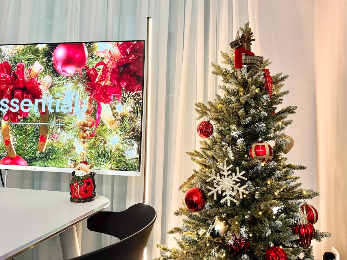 A contemporary bedroom features a spacious bed with soft linens. A large television faces the bed, showcasing a serene nature scene. Natural light filters through sheer curtains, illuminating a decorative plant in the corner, and a small side table enhances the modern aesthetic.