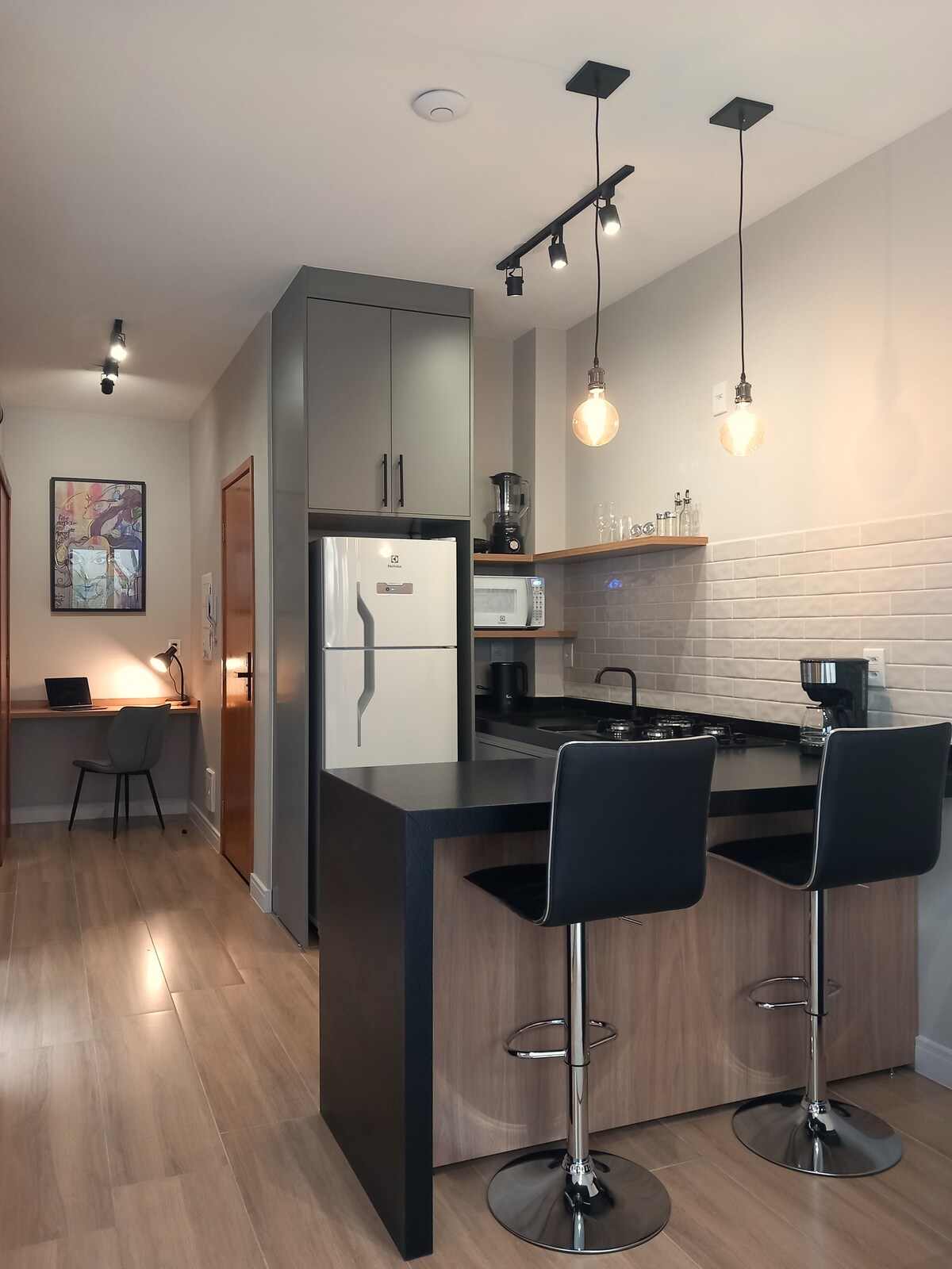 Spacious 40 m² (431 sq. ft.) apartment featuring a bedroom with a queen-size bed, a double sofa bed in the living room, 2 smart TVs with cable channels, a kitchenette with a cooktop, a minibar, a microwave, a blender, an electric kettle, pots, and basic utensils for preparing meals. Daily housekeeping and housekeeping service. 24-hour valet parking Gym, Outdoor Pool, Sauna, Pool Table and Home. Area served by a supermarket, pharmacy, and bakery; next to Av. Goiás and very close to Santo André.