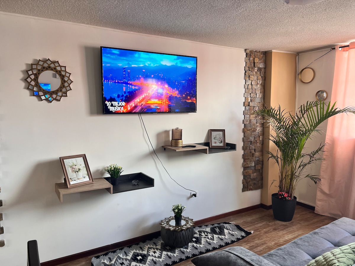 Furnished Suite. Valle de los Chillos (20 minutes from downtown Quito) Safe, comfortable, elegant place, close to multiple shops, banks, restaurants. (San Luis Shopping, ESPE) •1 double bed, 1 bunk bed. From the third guest onwards, a fee of 10 dollars is charged for each extra guest. •WiFi. •Kitchen. - 4-burner stove. - Refrigerator, Microwave. - Breakfast bar. •Desk. •TV (Netflix included). •Shower with hot water. • Balcony •Parking included.