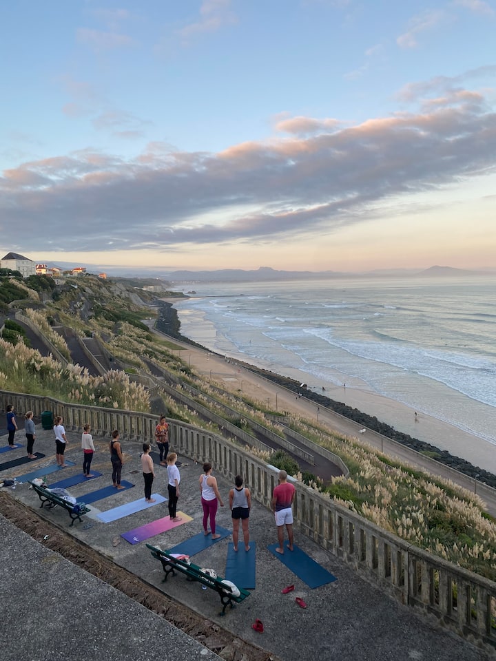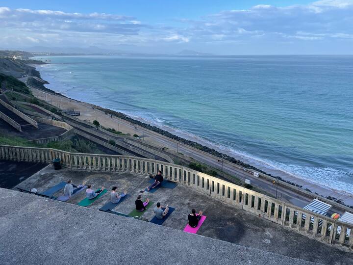 Yoga with ocean views at Côte des Basques . Bilingual classes (EN/FR), all levels welcome. Flow, breathe & relax in a stunning seaside setting. Small groups, good vibes only.