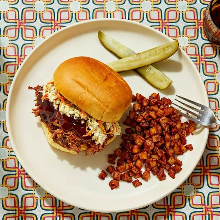 Tender pulled pork piled high, topped with cool coleslaw, and served with crisp roasted potatoes.