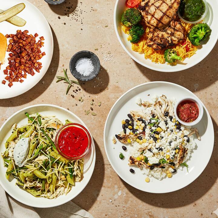 4 meals. Something for every craving— featuring Grandad's BBQ Pulled Pork Sandwich (pulled pork paired with cool coleslaw & crisp potatoes), Chicken Pesto Pasta (herby pasta with asparagus, red peppers, and ricotta), Piri Piri Chicken Thigh (chicken with turmeric rice & a spicy cilantro sauce), Mexican Chicken Bowl (braised chicken with rice, smoky black beans, corn, & chipotle crema). Includes 1 of each meal.